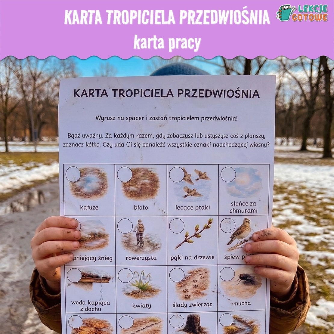 Produkt zawiera jedną kartę pracy w formacie A4 w pliku PDF, gotową do natychmiastowego wydruku. Na karcie znajdują się ilustracje oznak przedwiośnia wraz z podpisami oraz miejsca do zaznaczania zaobserwowanych elementów podczas spaceru.