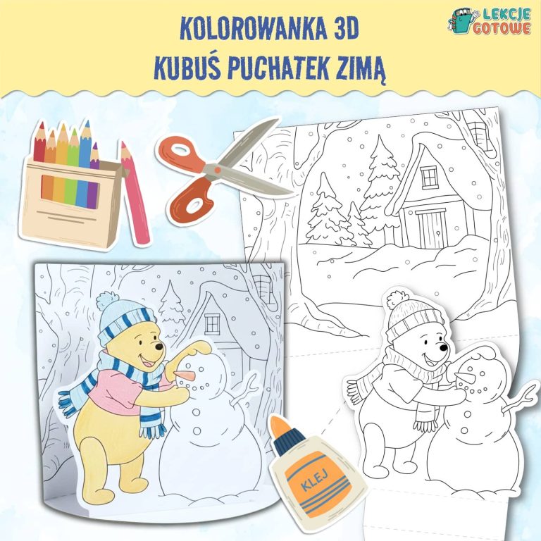 Kolorowanka 3D „Kubuś Puchatek – Zima” to kreatywna zabawa, która łączy kolorowanie z prostą pracą plastyczną typu wycinanie i składanie. Produkt idealnie sprawdzi się jako zimowa aktywność dla dzieci w domu, przedszkolu lub szkole, rozwijając wyobraźnię, motorykę małą i koncentrację. Po złożeniu ilustracja tworzy efektowną dekorację 3D z Kubusiem Puchatkiem i bałwankiem w zimowej scenerii. To także doskonały pomysł na zajęcia tematyczne z okazji Dnia Kubusia Puchatka, który obchodzony jest 18 stycznia.