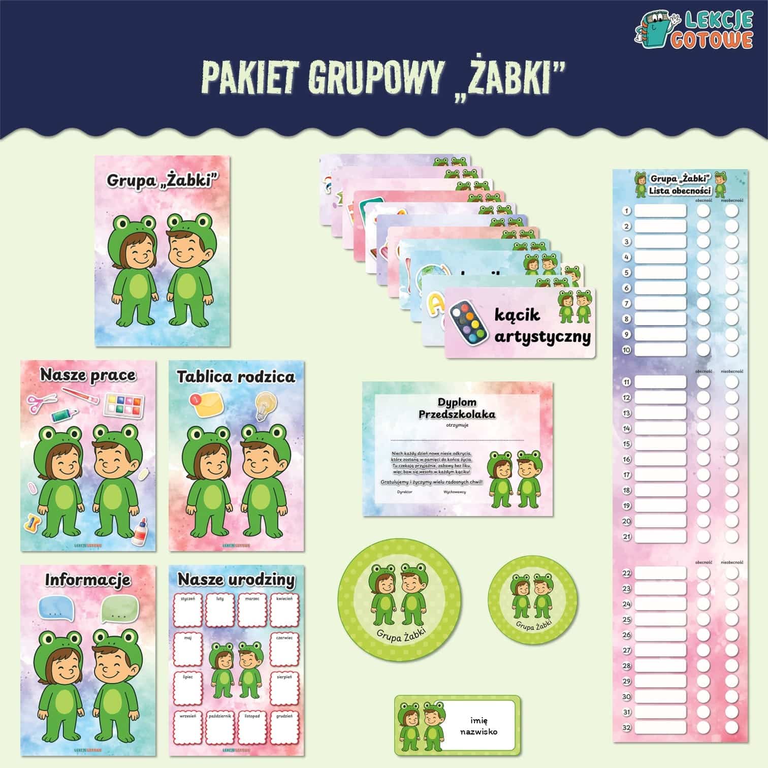 Pakiet grupowy Żabki to zestaw dekoracyjno-organizacyjny w formacie PDF do samodzielnego druku. Został stworzony z myślą o nauczycielach przedszkola, którzy chcą w estetyczny sposób zorganizować przestrzeń swojej grupy.