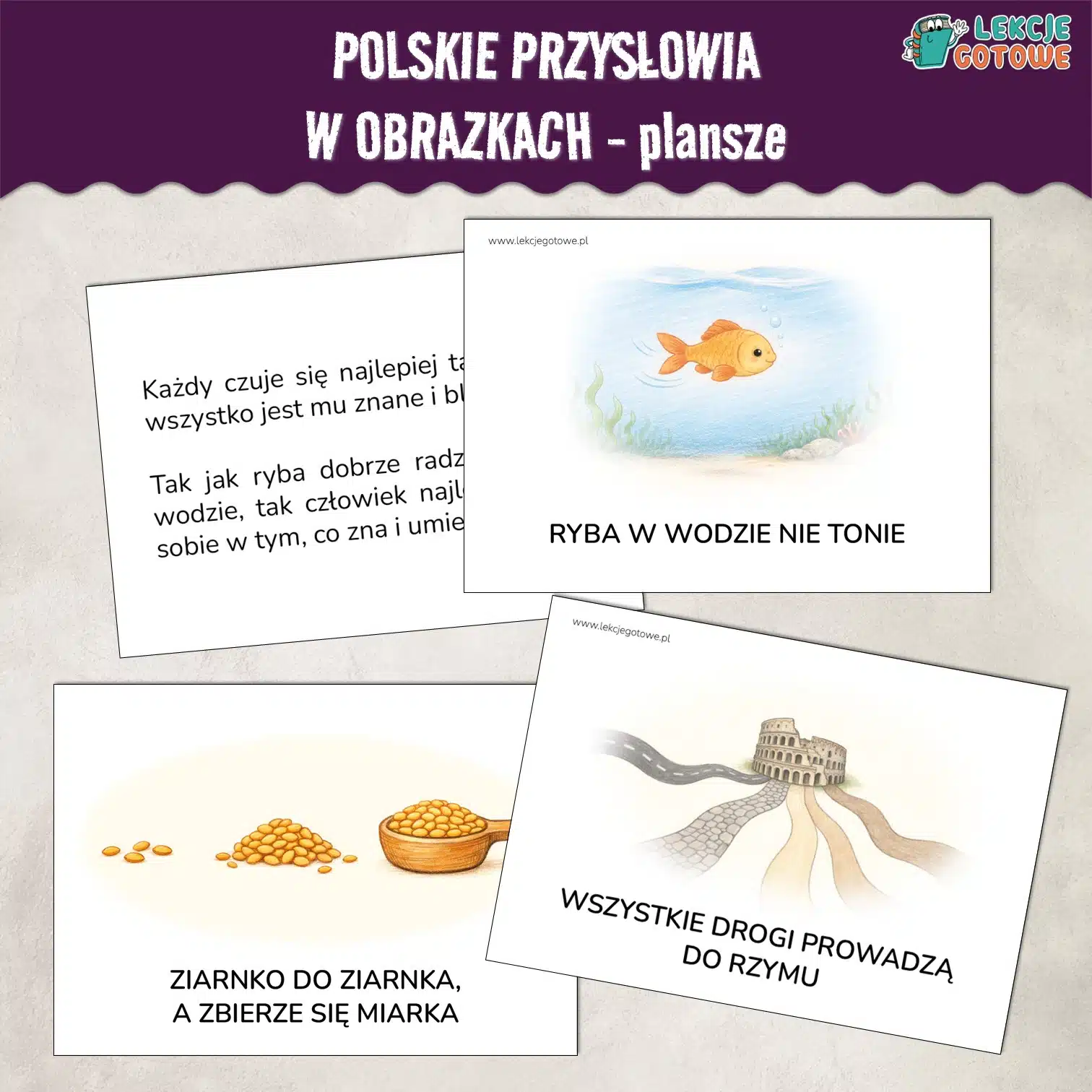 „Polskie przysłowia w obrazkach – plansze” to gotowy materiał dydaktyczny, który w prosty i atrakcyjny sposób wprowadza dzieci w świat mądrości ludowej. Dzięki połączeniu ilustracji i krótkich wyjaśnień uczniowie szybciej rozumieją znaczenie przysłów i potrafią zastosować je w praktyce. Co więcej, materiał wzbogaca słownictwo i rozwija kompetencje językowe, jednocześnie wspierając naukę poprzez skojarzenia obrazkowe.
