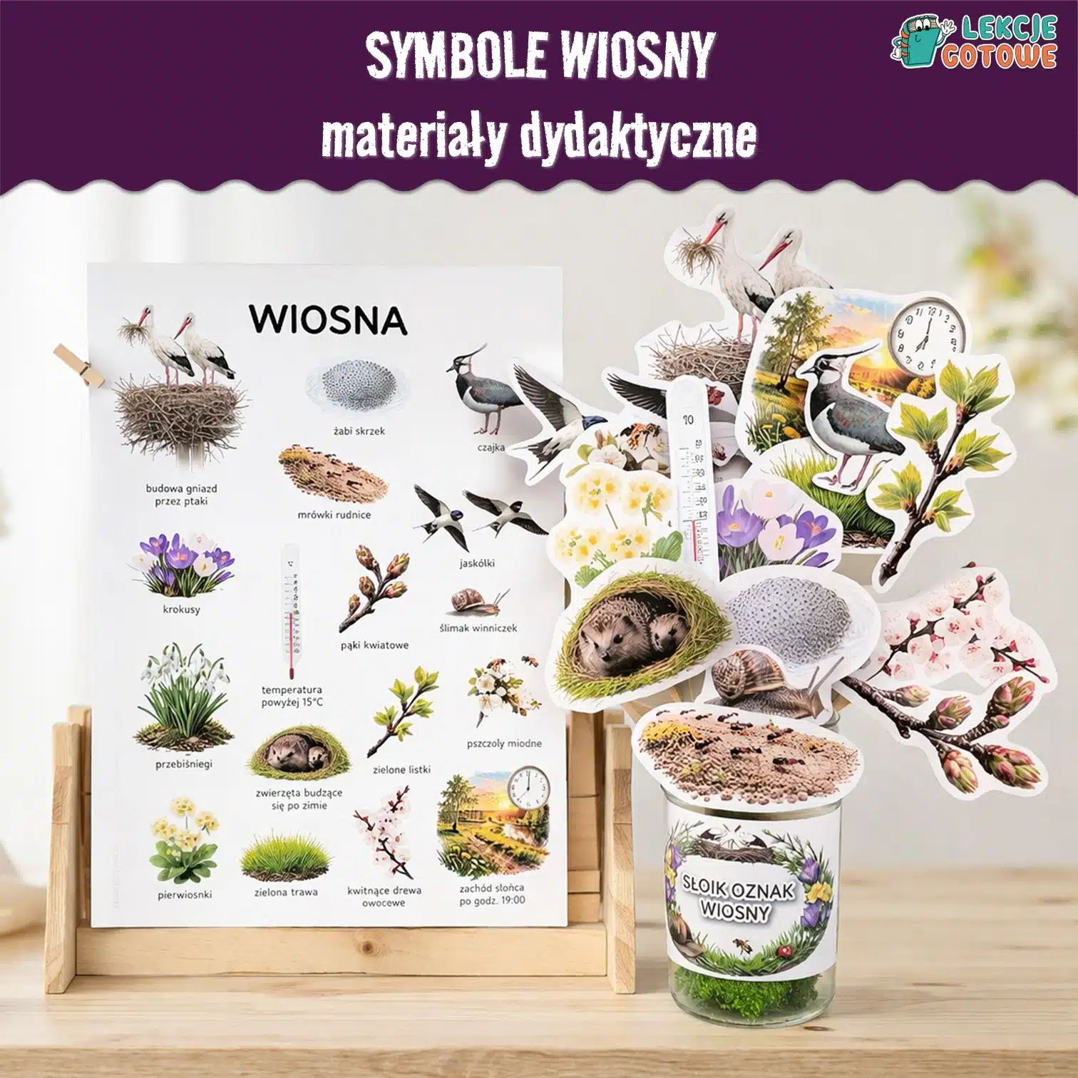 W zestawie znajdziesz czytelny plakat „Wiosna” (format A4 i A3) oraz zestaw ilustracji przedstawiających najważniejsze oznaki tej pory roku. Materiały zostały zaprojektowane tak, aby wspierać rozwój słownictwa, obserwację przyrody oraz naukę poprzez zabawę. Dodatkowo w zestawie dostępna jest etykieta na słoik w dwóch rozmiarach. Dzięki temu możesz łatwo stworzyć razem z dziećmi kreatywny „słoik oznak wiosny” i wykorzystać go jako element zajęć lub dekorację sali.