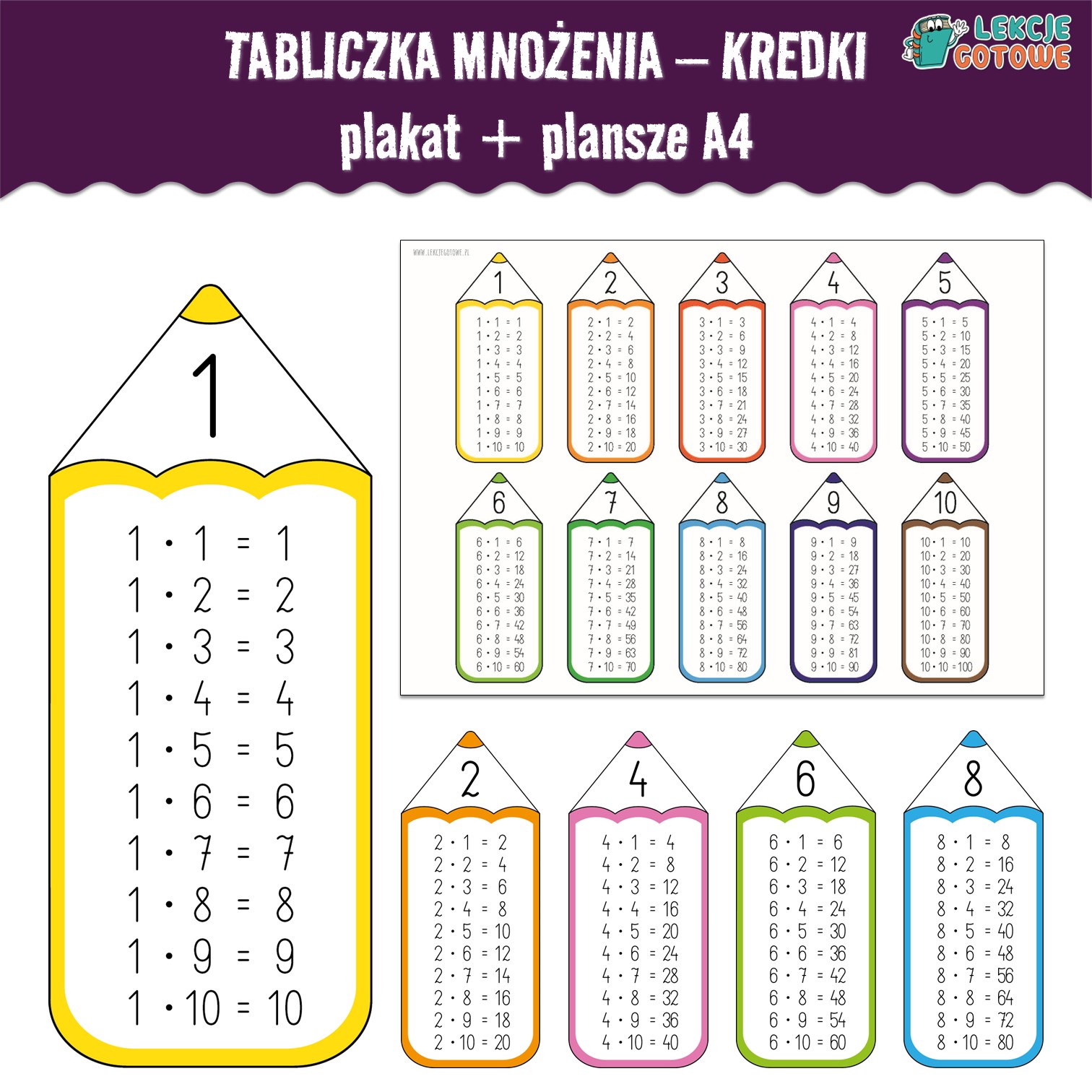 Zestaw zawiera plakat do druku w formatach A4 i A3 oraz plansze z tabliczką mnożenia od 1 do 10, gdzie każda tabliczka została przedstawiona na osobnej kartce A4 w formie kredki. Całość zaprojektowano w przyjaznej i czytelnej formie, która ułatwia zapamiętywanie oraz zachęca dzieci do nauki matematyki.